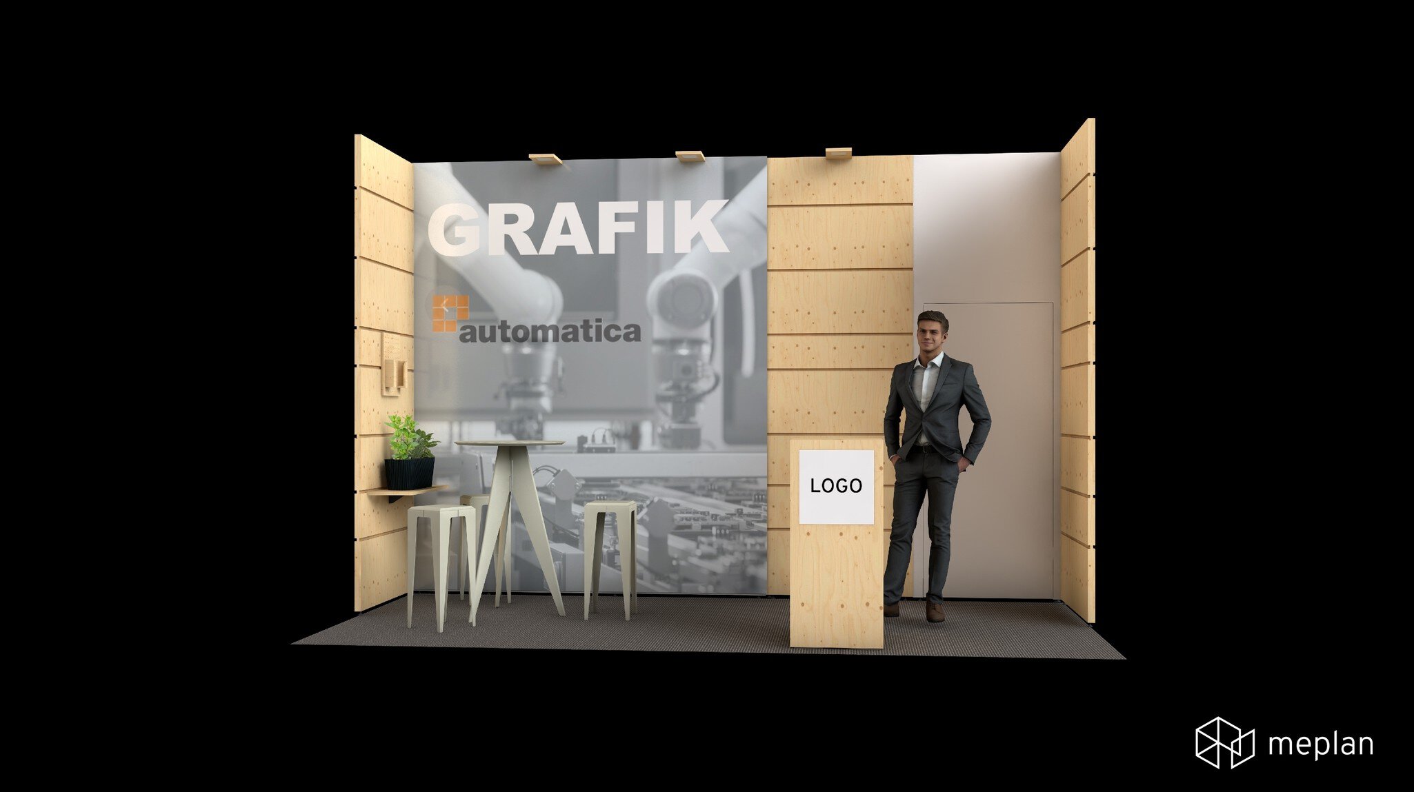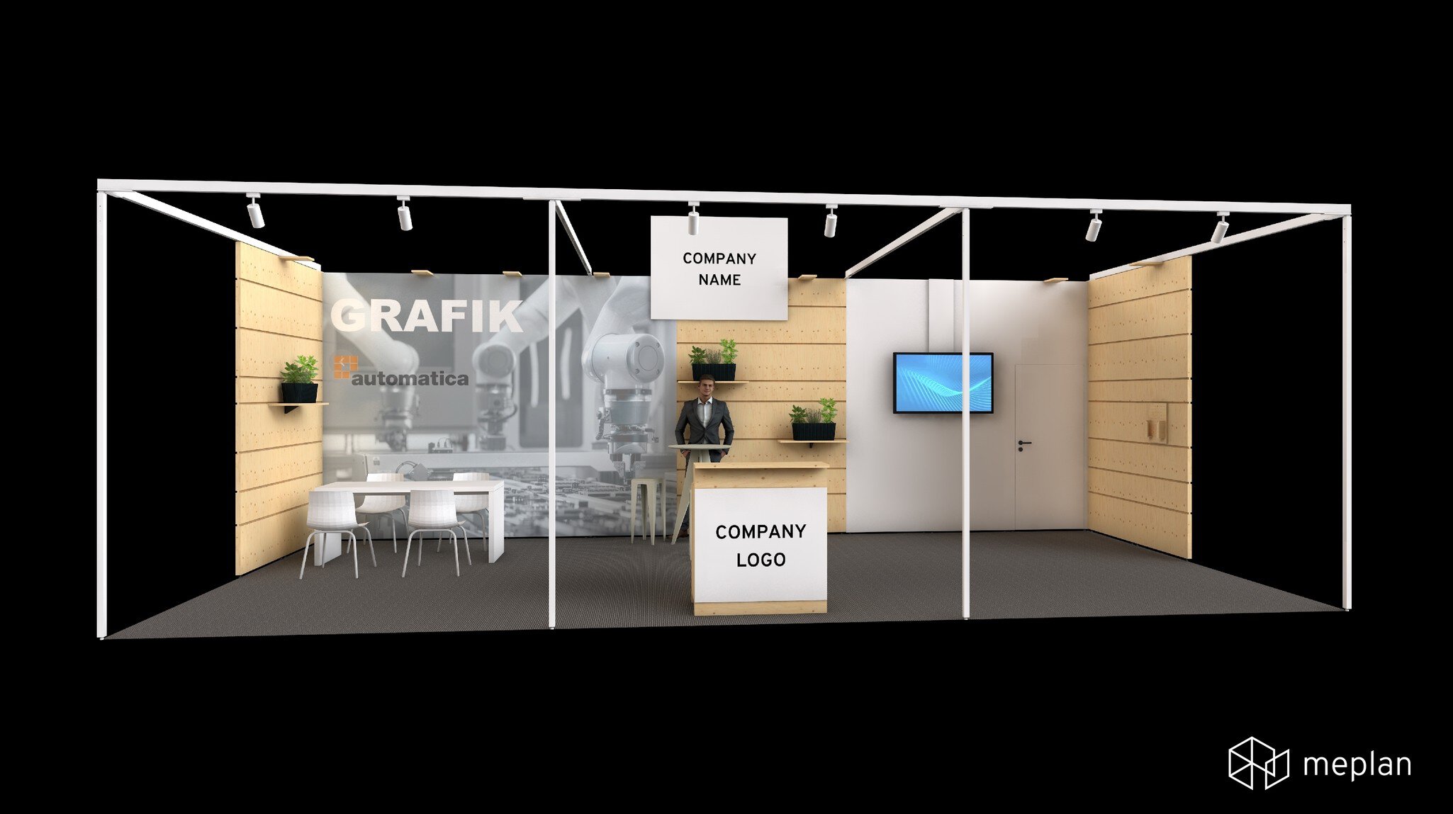 - Stand construction: rear wall of white wall elements (3.00 m in height) with a wooden rear wall element and lateral walls with functional grooves to support accessories, gray carpet