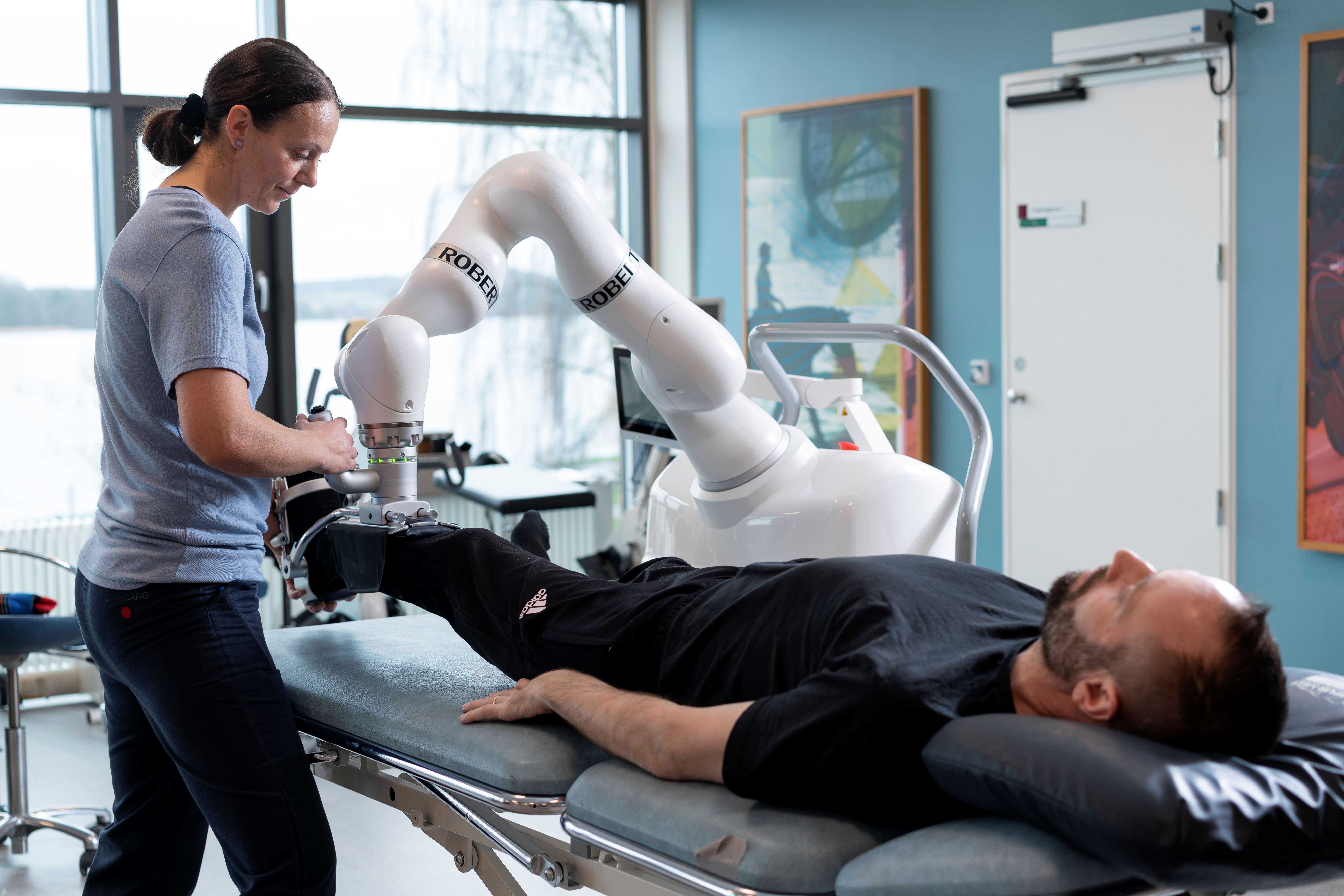 The robot’s functional principle is quite simple: The nurse attaches the robot arm to the patient’s leg, for example. Pressing the start button causes ROBERT® to raise the leg slightly. Now the nurse can manually perform the therapeutic movements. ROBERT® memorizes this movement so that it can then perform it independently—exactly as demonstrated and as many times as required.